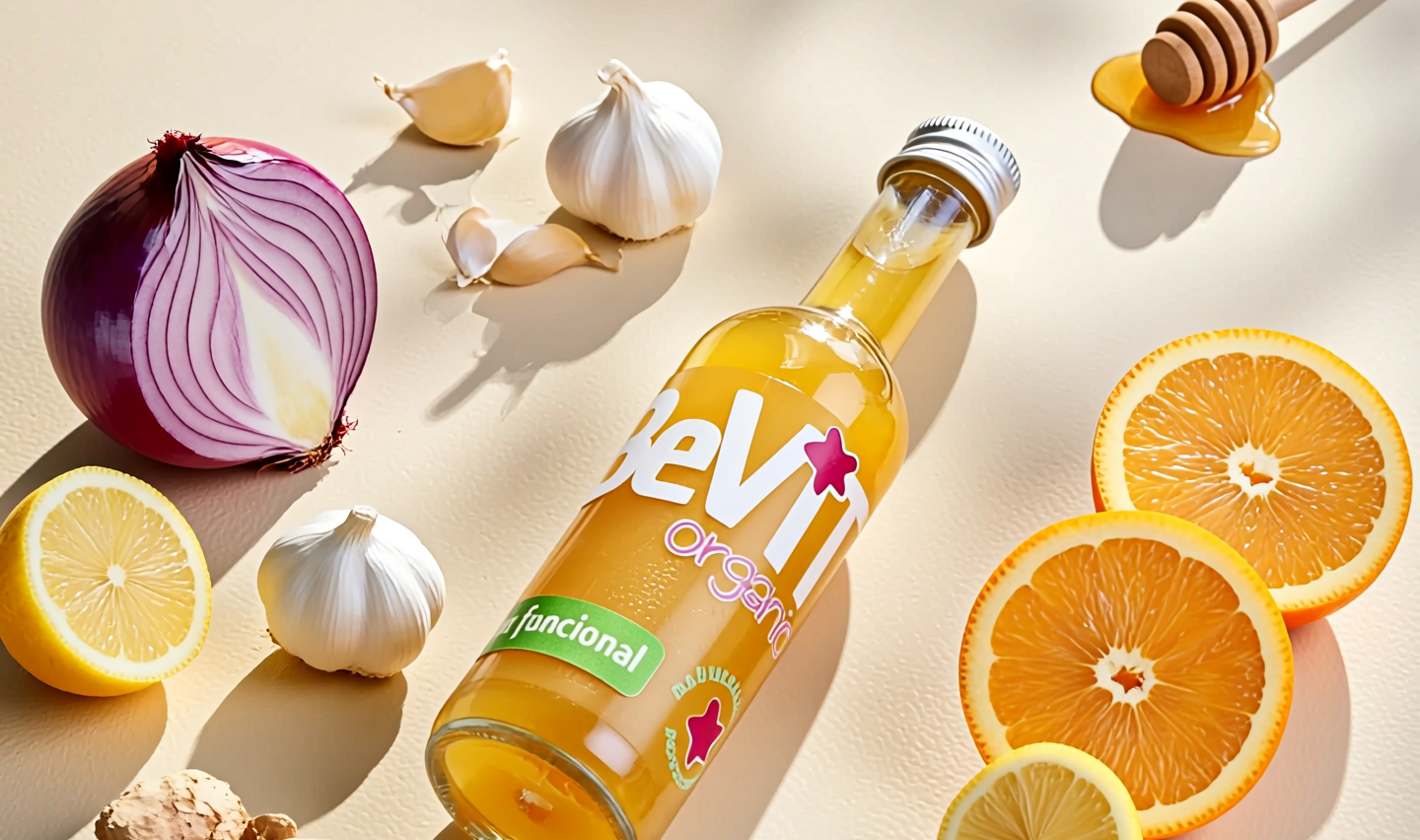 Cebolla, ajo, miel, jengibre, canela y cítricos se unen en una mezcla artesanal que aporta bienestar real sin aditivos ni artificios.